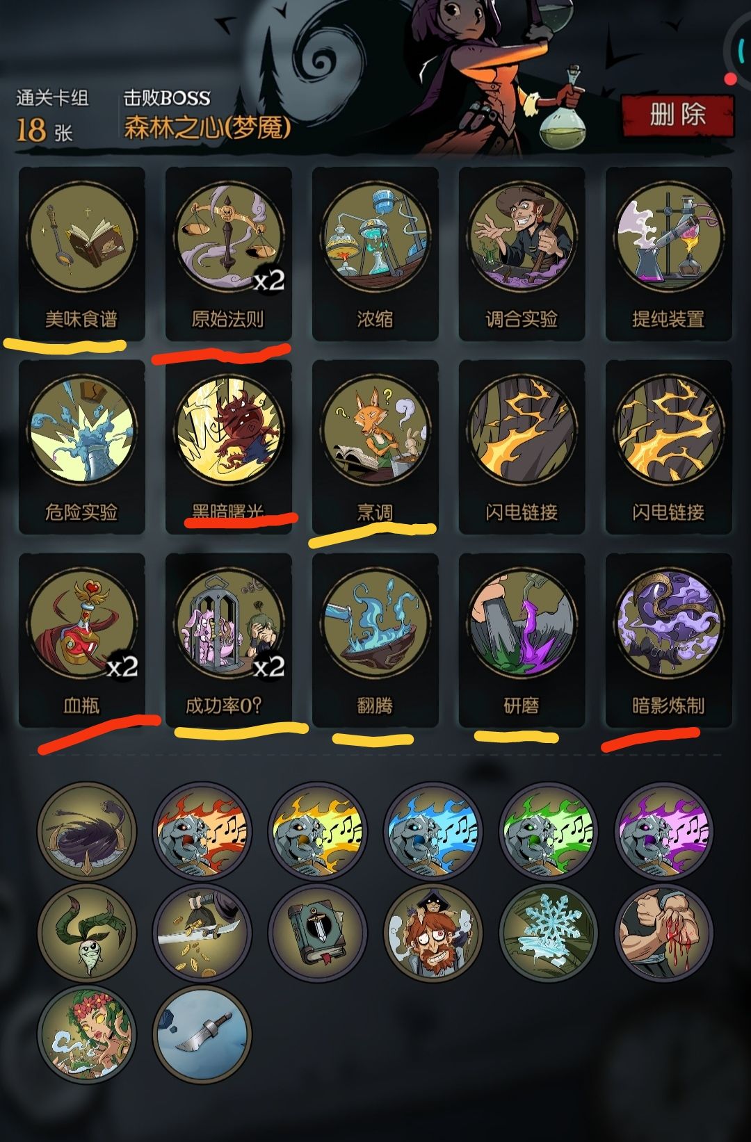 ———— 应邀单独开一帖来简单说明玩法,只是我自己琢磨出来的套路还不够完善,卡组精简程度烦请见谅,好了,先上图。 出发点依据美味食谱移除流的思路 上图红字标注为暗血流的卡,黄字为食谱移除流的 祝福选择,暗影之泉,瓶中小人,基因重组,由于只拿到了暗影之泉所以卡组不太敢删牌,如果后两个祝福到手10张左右就能完成FTK 暗影之泉,每使用1张牌获得2点血量上限,流派的根本,不管是移除流还是暗血流都需要 瓶