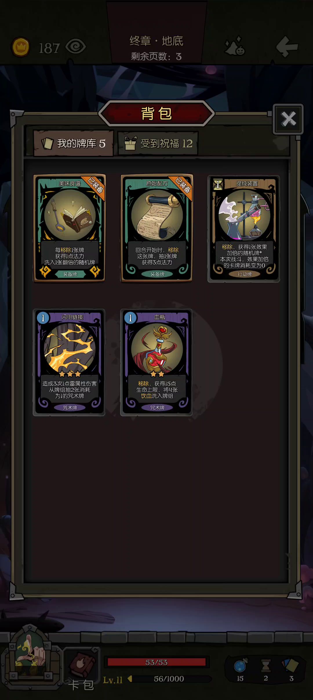 5卡牌药剂师最高难度通关,请各位大神指正。原本想单血瓶通关的,但是钱不够删不了牌了😅