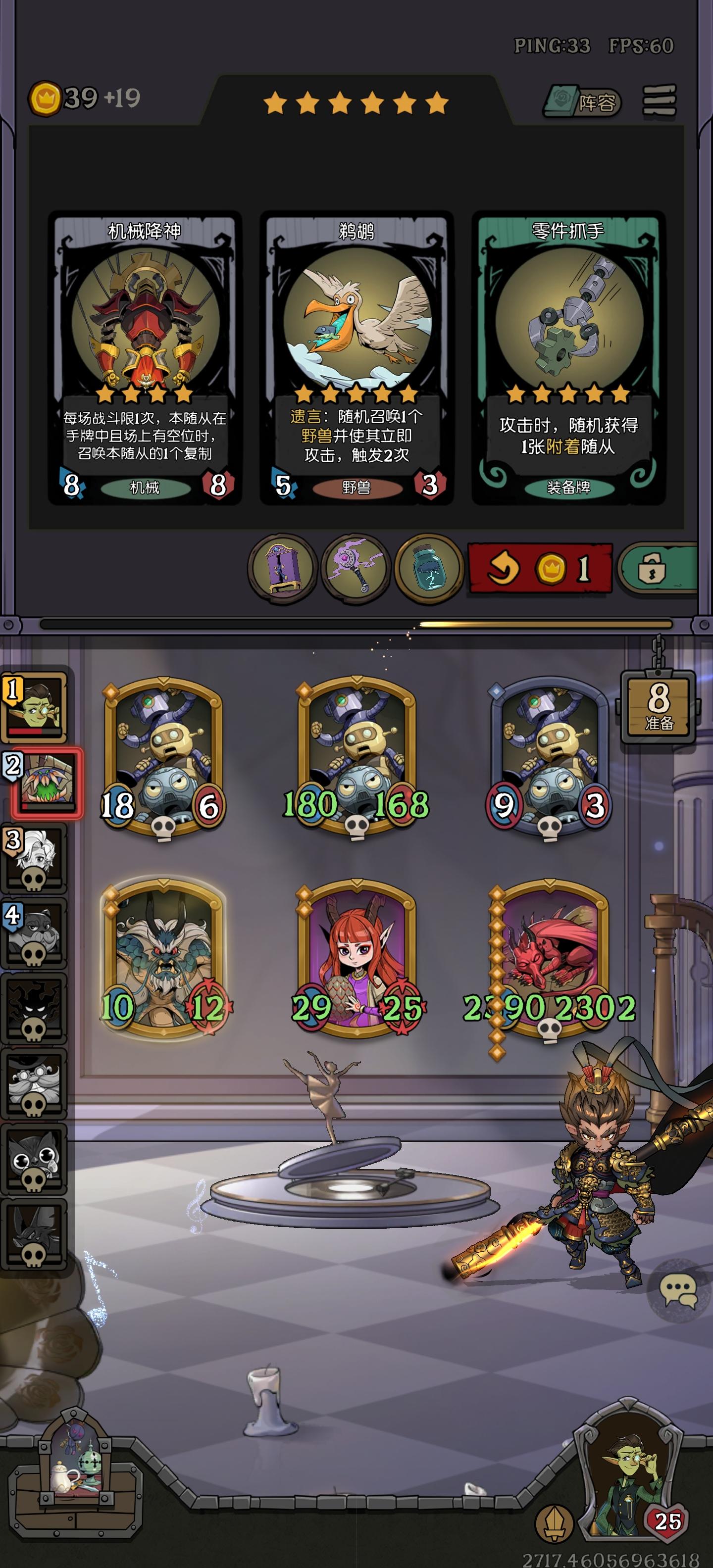 一开始选英雄的时候看到舞会明星有能量电池升级快,看整容的时候只知道龙和战士能组在一起,虽然持盾战士被削了只能给战士随从多盾,但还是决定玩先手龙,毕竟灾厄巨龙组收藏家相当于电表倒转打钱还是很快的。中间女巫珍宝看到出了缝合技能就拿下了,想着后期给灾厄缝神射能直接拿到第一波收藏家的钱这样子不亏。后面收藏家没看到,看到了舞伴伴唱鸽手,出第一只伴唱鸽手的时候想着没那么多钱开技能,而且舞伴多了也放不下没什么用