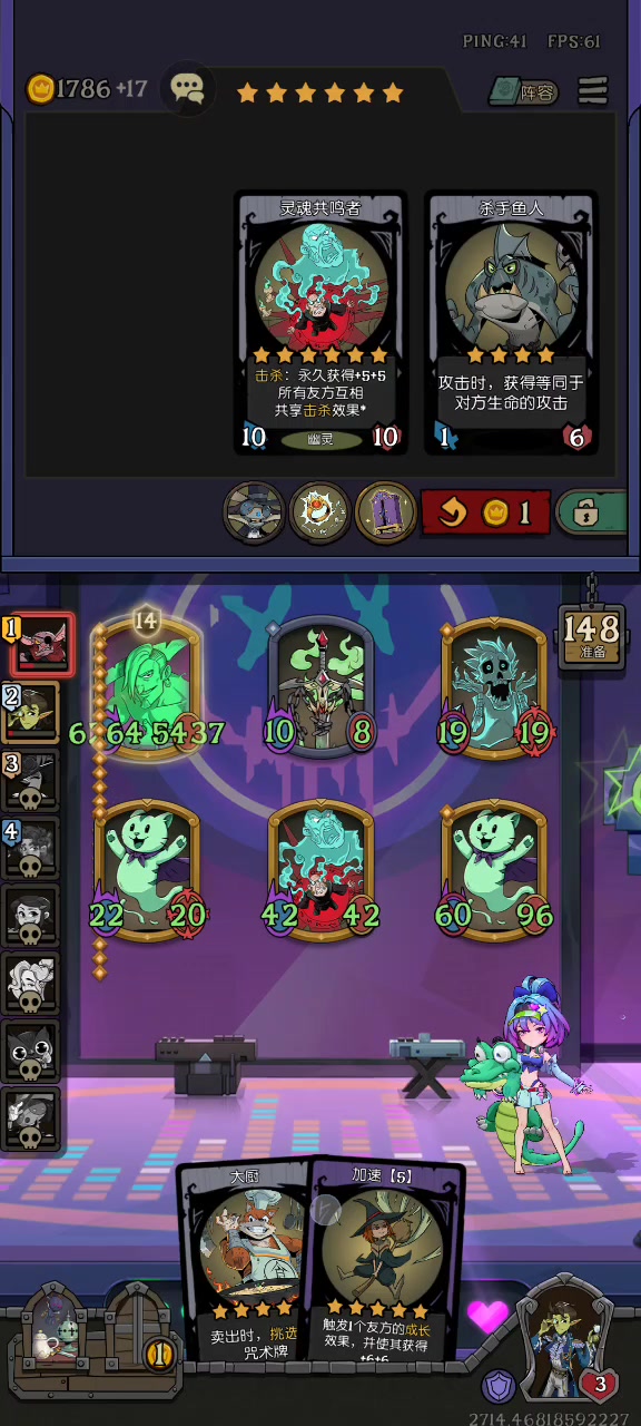 一开始选英雄的时候看到舞会明星有能量电池升级快,看整容的时候只知道龙和战士能组在一起,虽然持盾战士被削了只能给战士随从多盾,但还是决定玩先手龙,毕竟灾厄巨龙组收藏家相当于电表倒转打钱还是很快的。中间女巫珍宝看到出了缝合技能就拿下了,想着后期给灾厄缝神射能直接拿到第一波收藏家的钱这样子不亏。后面收藏家没看到,看到了舞伴伴唱鸽手,出第一只伴唱鸽手的时候想着没那么多钱开技能,而且舞伴多了也放不下没什么用