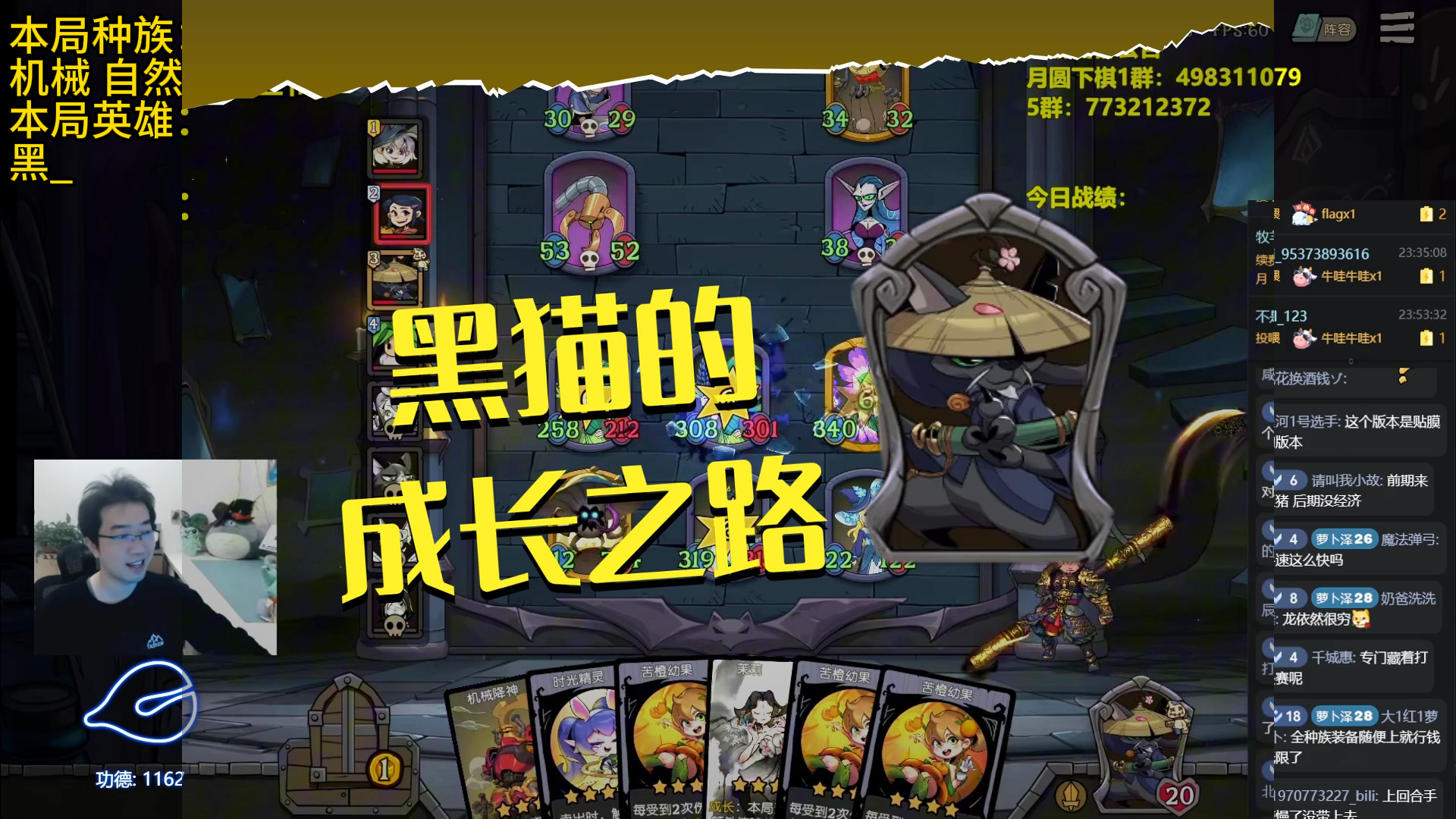 一开始选英雄的时候看到舞会明星有能量电池升级快,看整容的时候只知道龙和战士能组在一起,虽然持盾战士被削了只能给战士随从多盾,但还是决定玩先手龙,毕竟灾厄巨龙组收藏家相当于电表倒转打钱还是很快的。中间女巫珍宝看到出了缝合技能就拿下了,想着后期给灾厄缝神射能直接拿到第一波收藏家的钱这样子不亏。后面收藏家没看到,看到了舞伴伴唱鸽手,出第一只伴唱鸽手的时候想着没那么多钱开技能,而且舞伴多了也放不下没什么用