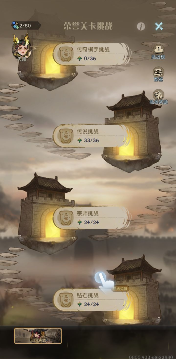 没买体力,天赋只点前2排和商店多一个格子,一路3星打到传说最后一关,然后玩战士就被对面天胡制裁了,这传说第12关压力有点大呀,关键传说对面阵容是固定的,等等体力恢复和点一些曹操的天赋了