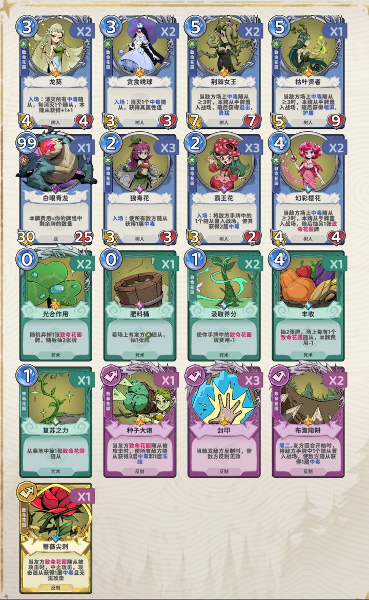 特意花了36体验了全角色,总得来说,平衡做得一塌糊涂,我不知道原来是这样,还是抄都没抄没明白,后期除了高贵的直伤流,其他流派简直就是一坨。1.补血卡和再生系列的简直就是笑话,除了前期过度能用,后期治疗量即便过千,再生过百也毫无意义,伤害根本跟不上,最搞笑的是输出附魔个吸血的就能完全替代,几秒一次伤害加回血。2.主毒和主火我都试过了,拿不到叠双倍的卡,简直就是翔中翔,即便拿到了,出伤太慢了。同样