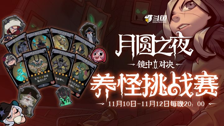 11月10日-11月12日每晚8点,8位月圆之夜高分选手开启养怪挑战赛!直播传送门:https://www.douyu.com/65962【参赛嘉宾】熊熊jolababy、手残的Q酱菌、兮柚丶、陈依小哥哥、羊驼不知怎么咩、早九张、核糖汽水、渊镜lorre【活动规则】养怪挑战赛期间,主播每晚8点开始进行聚会比赛,每天5局,共进行3天 15局比赛;每位主播以每局赛后战绩面板展示的数字为准