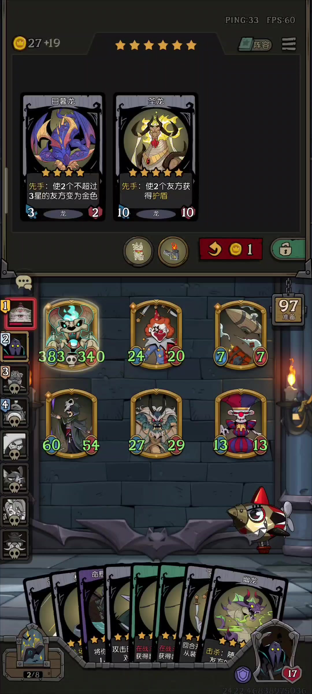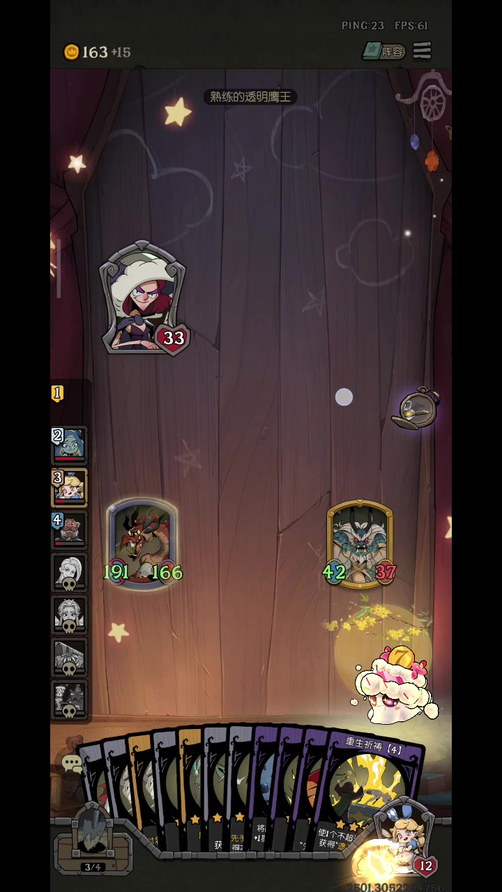 这本来是我阵容最完美的一次,传功龙大成,套娃魔女也小成了,就差一张套娃!天使手镜出来的一刻我就想玩儿套娃魔女了,装备也是最全的一次,小丑复制抄写笔,抄写笔复制小丑,直接左脚踩右脚实现装备自由了,后面果断换阵容,虽然传功龙数值涨得很爽,但用魔女换掉对面大身材不更爽么[表情_斜眼笑],但是啊,发牌员又从中作梗了,就是再刷不到套娃了,后面刷了四五十次也没刷到,也没有时间让我抄写笔再复制一张套娃了,最终饮