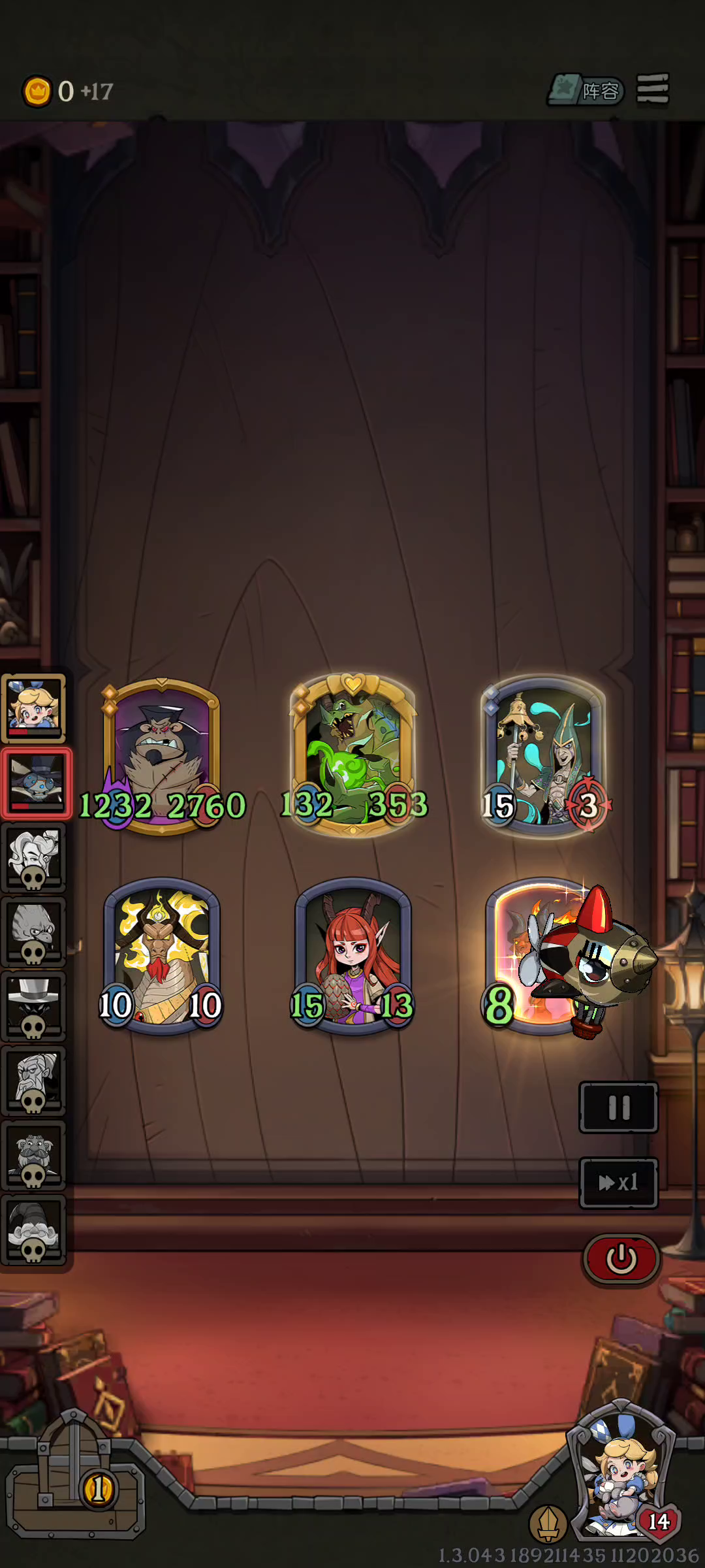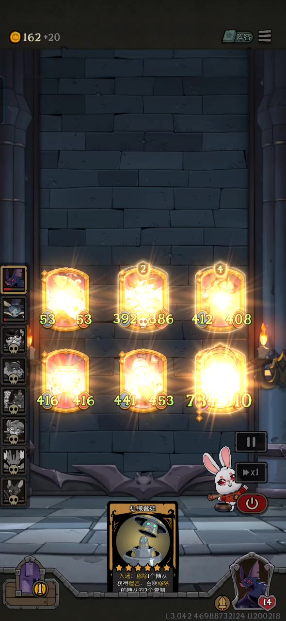 小石精+贪食绣球,带上装备疯狂加身材[表情_斜眼笑] 可惜没刷出来恶魔天平,不然腾出新位置后 可以更猛 (任务是红心魔杖,契约者用剑术陪练养的,原本就想着刷出恶魔天平然后拿去喂了,结果一直没腾出去[表情_捂脸哭];不是不能刷,因为我手里有个眼花缭乱,纯属运气差...) 具体思路: 开局看给不给小石精,不给不要玩(如果已经拿了小树精,可以考虑花钱d下牌,不过一直不来就不要浪费钱了,准备换阵) 拿到小
