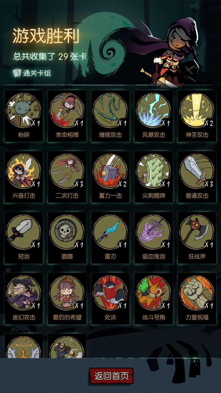 (虽然各职业已通关,但只截下此图。有些卡片只记得效果不记得名字,我对阅读带来的不便在此说声抱歉,如果出现什么错误还望指出)郑重声明:过牌永远是此游戏的第一要素四大职业的难度系数和其标注的星数还是比较吻合的,那我就从易到难分析一下。首先是骑士,自带技能每五次战斗可以升级一次卡片,整体来说可以省下去铁匠铺升级的钱,但弊端就是升级周期太长,前期伤害不足,有一大堆卡片急需升级,所以建议可以遗忘一张普