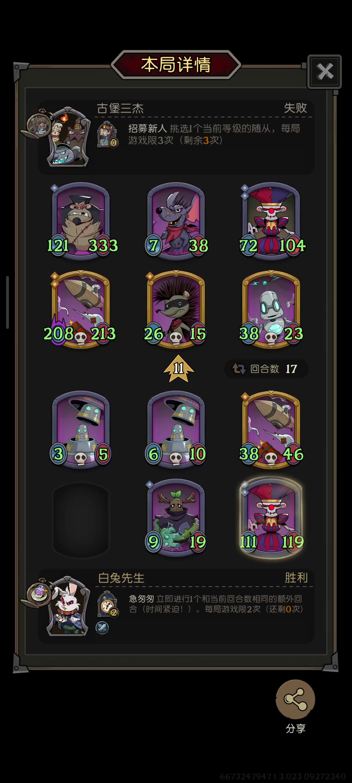 我上个回合是木偶加飞艇前排,这回合就猜到他要后置大哥果断套魔女,把筑甲师多盾一卖,然后噼里啪啦一顿操作,把魔女身材养大,然后领主就来了,真无语,领主身材没有条件养了,对面还有射手,也活不下来,只能猜对面这样站位,然后魔女打了一波烂团,本以为要输了,没想到机械狗说他还有操作,狗运降临,出了猫头鹰,神乎其技!!!!