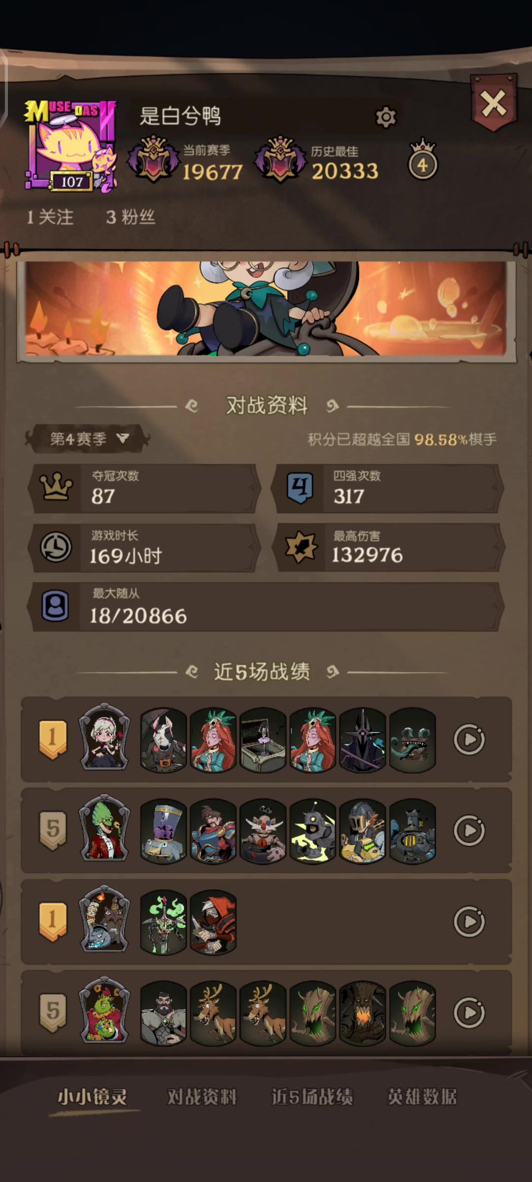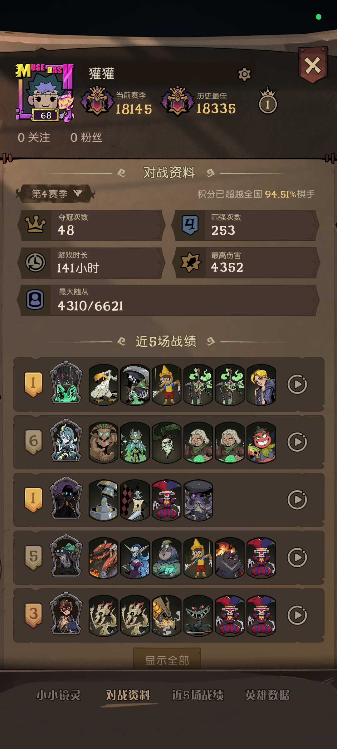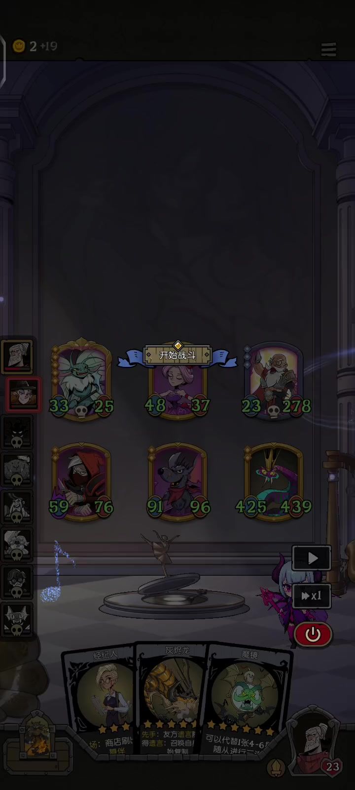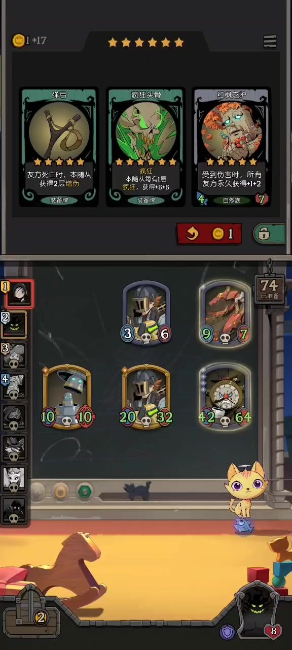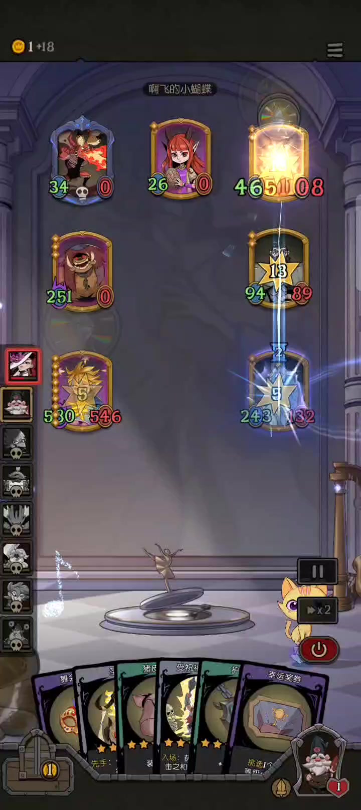 有幽灵的局基本上是以击杀流为主(幽灵击杀或者野兽击杀),前期发育快,缺点是怕大身材(星裔和自然)和被对策(阵容太固定了)。特别是后面几个回合,一直在担心遇到大身材(单大哥怕被对策)。中期的时候出了老鼠,蝴蝶也还在,但是考虑到玩的是狼王,还是卖掉了;狗头刷了两个,但是一直刷不出加赠伤,咒术,入场。
