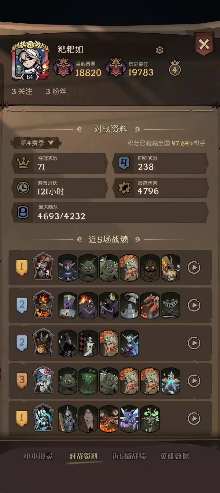 最后是一点都不合适的卡组和舞伴英雄技能的2个活下来了[表情_豹哭]。(每次拿女王都没自然族,这把对面也没有幽灵[表情_星星眼],旗鼓相当的双方)