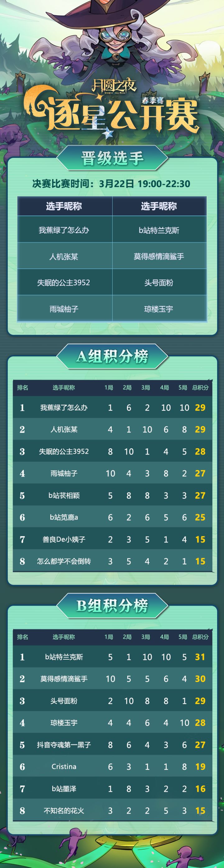 🌙星光汇聚,逐星征途近终章!逐星公开赛春季赛总决赛半程战报出炉,8 位强者从 16 强中突围,即将迎来最终对决!从全民海选到总决赛,每一局都是对策略与心态的考验。A 组同分榜首的焦灼、B 组高分领跑的强势,都让明日的决赛充满悬念。⏰ 3 月 22 日 19:00-22:30,最终决战打响!锁定直播间,见证冠军诞生,领取观赛福利!这场逐星之旅的最后篇章,你将为谁呐喊?#月圆之夜 #逐星公