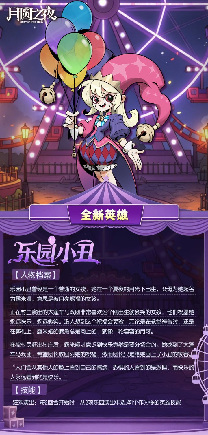 🌙 被月亮赐福的女孩,戴上小丑妆容,将悲喜都化作乐园的欢笑——🎭 技能「狂欢演出」:每2回合开始时,从2项乐园演出中选择1个作为你的英雄技能。🎪全新英雄「乐园小丑」露米娅,即将在 S11「狂欢游乐园」与你相遇。#月圆之夜s11 #月圆之夜 #卡牌游戏