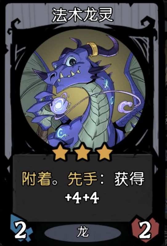 只要你掏出来一个,不管什么阵容,场上只要有2/3个触发先手,你的血量在保底前三。淘气小龙+超凡驯龙师,前期的战力更是稳稳第一。5个位置触发先手,3*5=15,2*5=10,一个随从就是+15+10,白色超凡驯龙师一回合直接+30+20属性。装备的先手效果能够触发,法术龙灵的先手效果也能触发。实战下来一回合超凡驯龙师能带来+40+30左右的属性。最主要法术龙灵还是3星的随从……这强度……