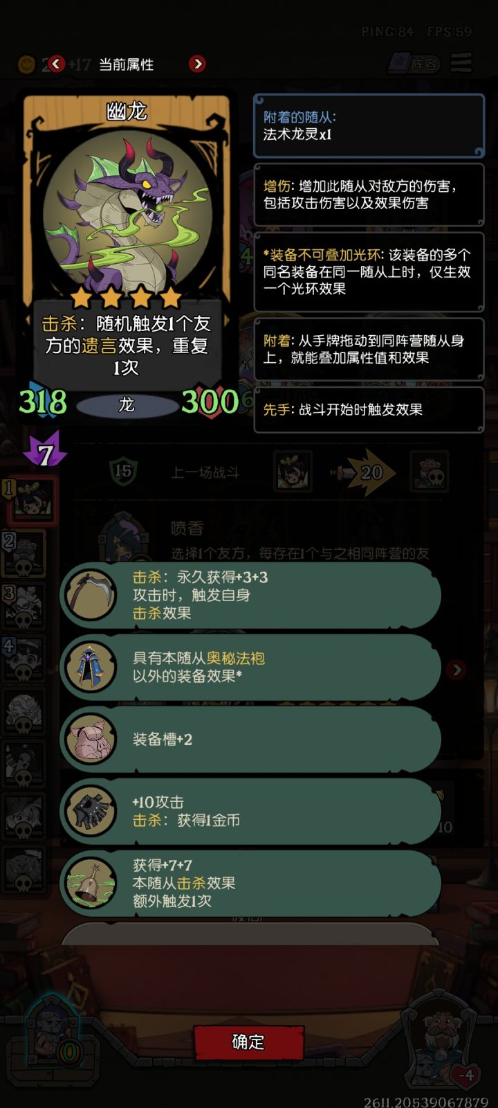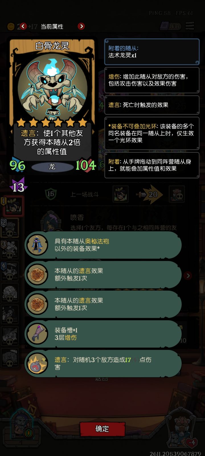 珍宝:每回合2选1普通珍宝,购买两个普通珍宝(缝合,技能多使用一次) 可惜都死太快了,结束太早了,没有拿到第二只亡魂铁匠,也没有拿到很多护盾装备,不然就是6倍装备的亡魂。 因为有塑形之沙,有可能会随机给到奥数法袍,所以买了很多加装备槽的装备。 如果完全成型:"亡魂铁匠"缝合"亡魂铁匠",装备效果*2。 "玩具商"复制2次亡魂铁匠,装备效果*3。 "奥数法袍"复制装备效果,装备效果*2。 2*3*2