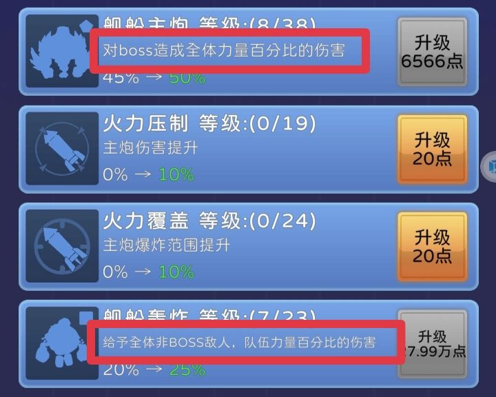 攻略3他来了,他真的来了[表情_汗] 4.说说跃迁和选择科技。科技里面必须要点的科技(按照顺序不分优先级)有:1船舱扩容(增加上场人数,最高5人,升满需要300科技点)。2舰船主炮(按照队伍的平均力量的百分比对boss造成伤害。这个等级根据下面的地图炮伤害走,地图炮能秒杀小怪,但主炮秒杀不了boss的时候就适当升一下,这样就不会因为小怪秒杀了但boss秒不掉,人物还得上去砍boss而浪费跃迁后的