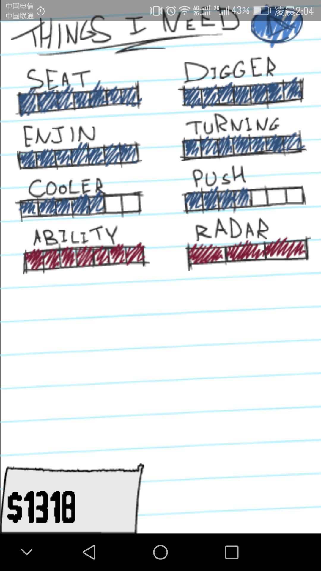 技能意思: Seat:血量,升级一次加一点血量 Digger:钻头,升级能让你挖得更快,升级会改变钻头形状。 Enjin:不知道,升级了感觉没效果 Turning:转向速度,点不点都无所谓的东西。 Cooler:制冷,升级会改变整体外观,最高级是火箭🚀 Push:推进力,经过地心挖掘速度会减慢,升级这个可以抵消,升级后头部会发生改变,满级同是火箭外观。 Ability:能源,升级会增加推进能源最大
