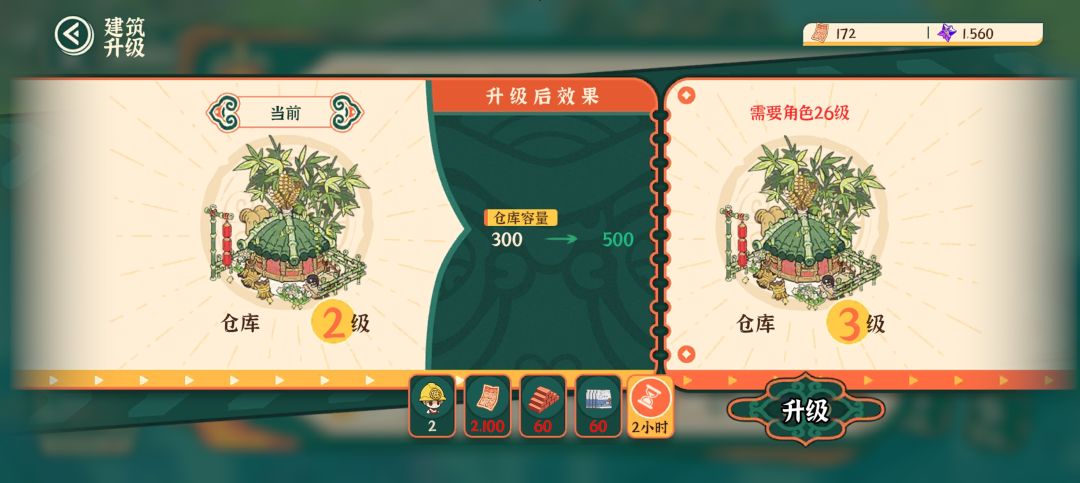在最前面:九级之前可以不限量免费加速。 问题反馈:仓库容量太少了。 首先只能建两个仓库,升级还要卡等级,然后容量也没增加多少。 其次远征需要大量物资,后期建筑需要大量物资,基础物资也很多。650个格子根本放不下。 #代号锦官城奇妙冒险TapTap测试版 升级方法:种植、生产、建造(装饰建筑无经验)、贸易(电视订单) 角色升级方法:远征获取菜肴 远征的正确方法:选择一个up角色,然后物资拉满。 探