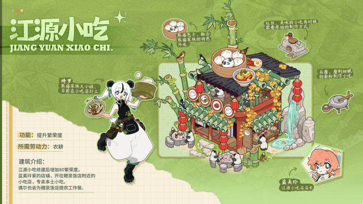 作为一家百年老店,「江源小吃」的招牌在鲤泉城闻名遐迩。店家小姐蓝美玲年纪轻轻就扛起经营重任,为人称道。不过原本是一家卖小吃的小店,不知道从什么时候开始,越来越多的食铁兽喜欢在门口做客,仔细一问,原来是他们家大小姐在这里帮厨呢!想不到食铁兽还喜欢吃小吃,这真是件稀罕事,于是小店聚集了越来越多的居民来看热闹,店里的生意自然也越来越好了。————波奇分割线————熊猫做小吃?也算是鲤泉城特色了!