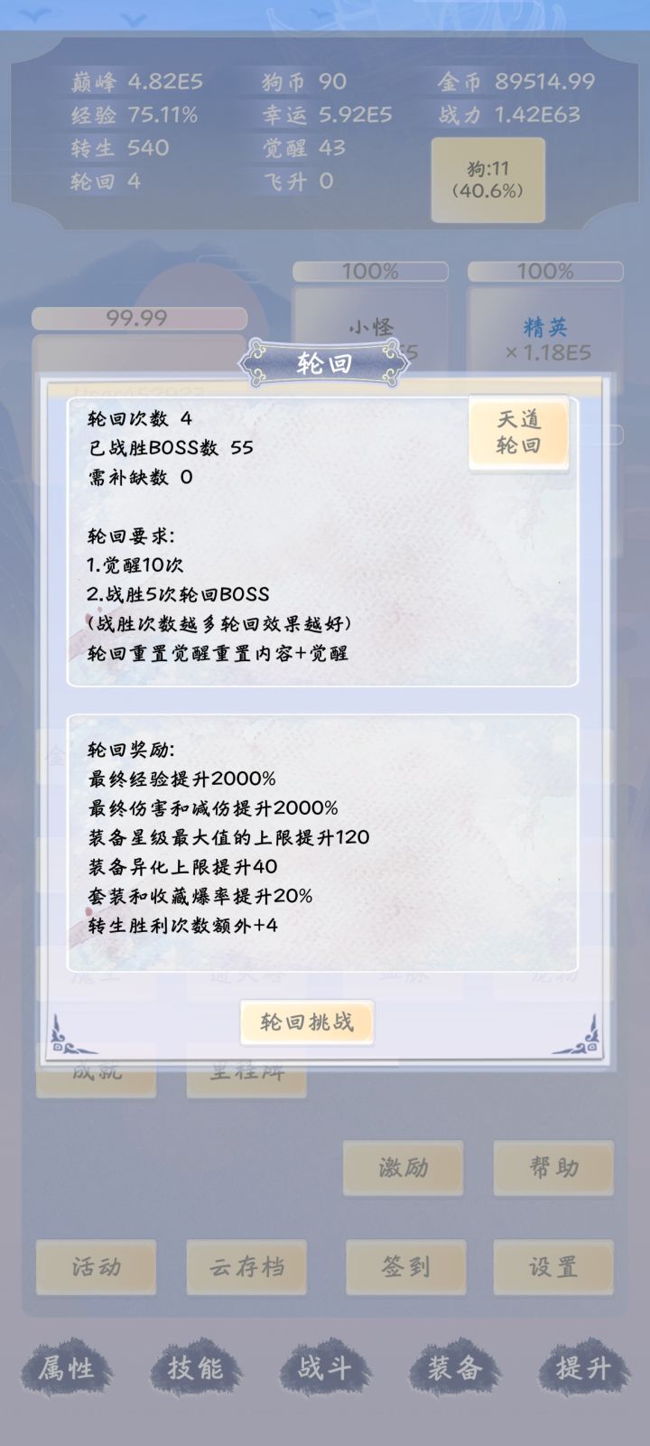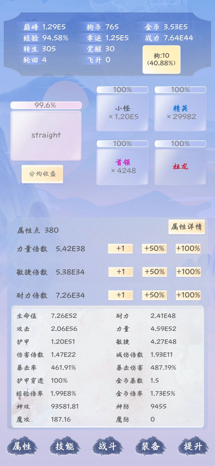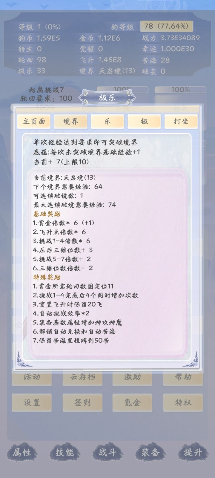 玩了一天了,目前轮3,16个小时基本前9个小时都在迷茫期,哪怕看了论坛的攻略,也特别迷茫,因为论坛攻略说太敷衍也不算,只能说不够具体。所以来讲讲个人的攻略,只针对从零到轮回结束,因为本人也才轮回3。这游戏前期的神攻和魔攻最重要也是最主要的增伤来源,游戏刚开始先把广告的10张副本券看了,然后狗币商店用副本券换狗币,能得到10000狗币,狗子先喂到10级,剩下的狗币全买百分比神攻,然后开始打怪升级。