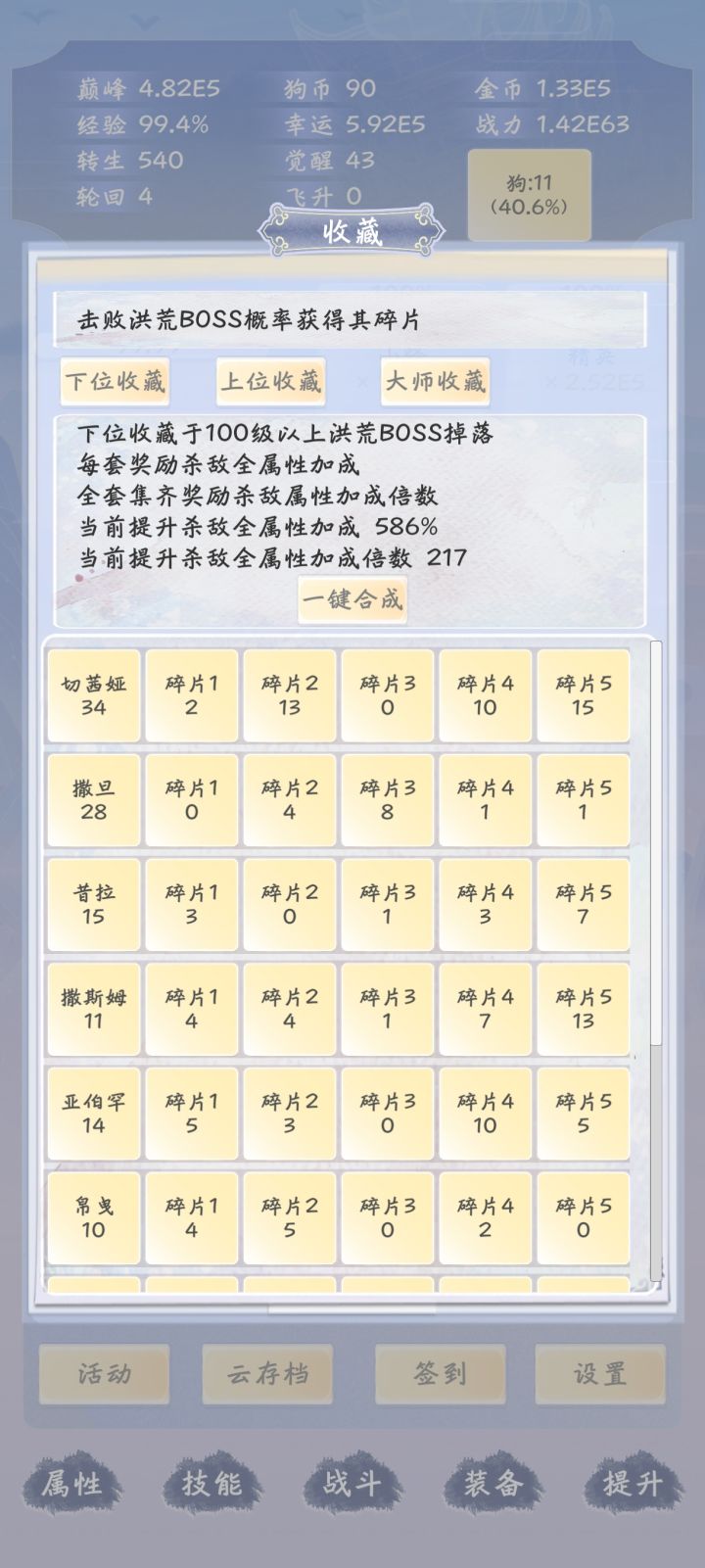 宠物经验修复了,直接让你们起飞,这两天都是白白浪费挂机的宠物经验。7-27的更新真的很ok。说说经验吧我是轮回2差一只就飞轮3了 实在打不动熬不住然后轮三到轮4很快 不细说 直接星级装备180星附近就过了轮4到轮5终于耗时一天多过了 星级装备不给力了 双条也打不到 动动脑筋搞到收藏上面 实测这收藏大概在线10小时差不多 属性全给幸运➕破甲带个一级砍疯 轮5我计划是先看看能不能打 能打就熬