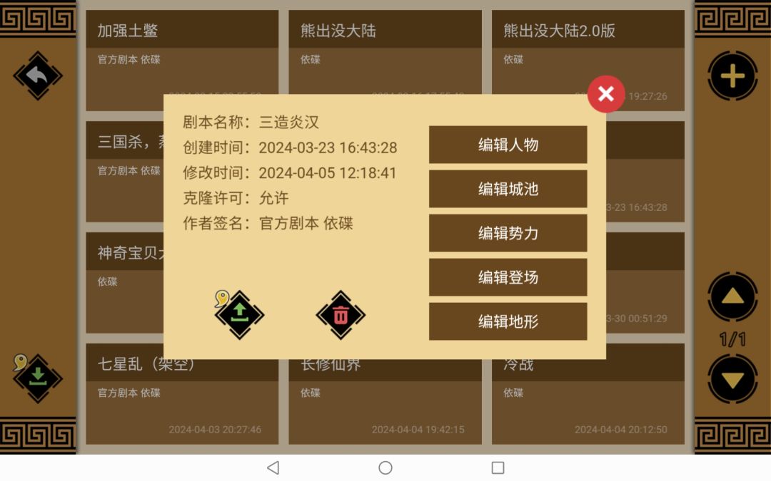 ——创作剧本 剧本创作需要花费不少的时间,模拟历史等资料寻找和填写都是枯燥的 所以如果你没有那么多精力,体验游戏核心玩法还是很好的 你花费的时间越多,地图内容越多,质量越高,乐意分享后可能会有更多玩家青睐你的作品 同时,也可以自我游玩创意娱乐,测试强度等其他操作 如果你在剧本中加入敏感(极度不良,邪恶,迂腐等)内容,是不被认同的!!! 进入界面建立模版 进入游戏自带的创作界面——创作剧本 左上角—