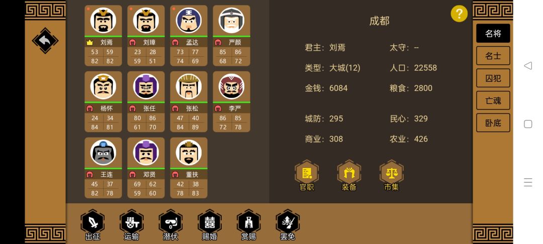 没啥好说的,找些出色的武将,造娃就行了,右下角建业城两个谋士一直给我生谋士8,9个80多,90多政治,智力的无限补,武将同理,还有就是多往防线关卡放钱,粮食,人口,他们人死了直接复活,从而达到无限补将,或后面的城放满武将直接补,啥模式都无解!但是人机会抢粮,而且会对一个城进行多次进攻,这就导致城池里面的武将还没来得及恢复,又要遭遇毁灭性打击,就算把城池抢回来,意义也不大了