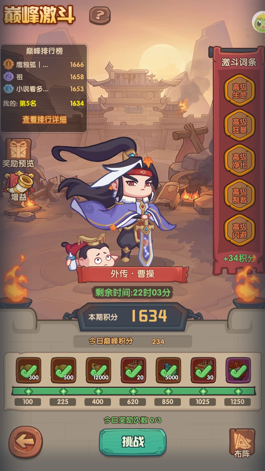 如果你开局选了曹操作为主C那么在第七天开启的曹操皮肤活动巅峰激斗玩法中会完全处于劣势.这套阵容可以在一众吕布貂蝉和关羽蔡文姬的阵容之外拿到排行榜前10(当然要看前面氪佬多不多). 1.战力达标第七天整队应处于3亿战力以上. 2.兵符需要至少洗出一个击晕词条 3.BOSS词条,开始可以先把除审判和锁血词条都开到高级.锁血开到中级即可 4.不要怕闪避多减怒多都是几率的,总有一把是只触发很少几次的.多次