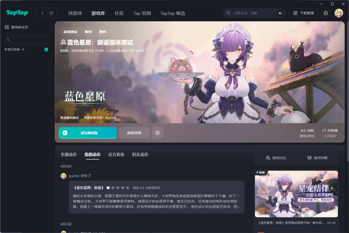 届时您可查看站内信确认自己是否已获取测试资格。已获取测试资格的星临者,在移动端可前往TapTap《蓝色星原:旅谣》游戏详情页进行测试包体的预下载,在PC端可前往TapTap PC客户端(TapTap PC客户端下载入口:)-《蓝色星原:旅谣》游戏详情页进行测试包体的预下载,待2026年4月3日 11