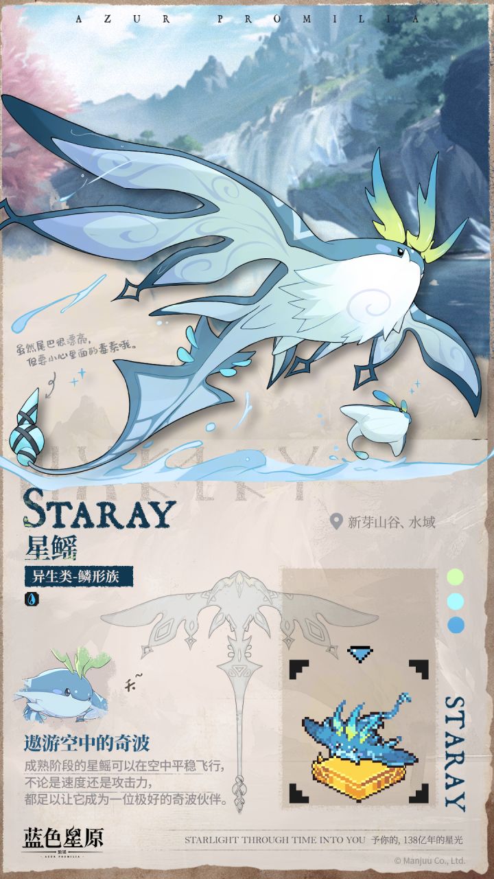 近日,蓝色星原旅谣再次放出了全新内容,全新奇波星鳐曝光,造型和设定都挺有看点,一下就吸引了不少玩家注意。 星鳐属于异生类鳞形族,是水属性奇波。外形走水生鳞系风格,整体看着灵动又好看,最有特点的就是它的尾巴,上面长着结晶,在阳光下会像宝石一样闪闪发光,平时在水边嬉戏的模样格外亮眼。 它的性格特别友善,还很喜欢让人摸尾巴,台词里都一直在念叨“尾巴不错,摸摸”。要是和它完成星结,它会变得特别黏人
