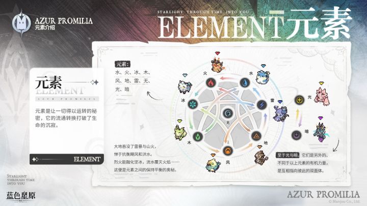 由上海科学技术文献出版社有限公司出版, 上海蛮啾网络科技有限公司运营的游戏《蓝色星原:旅谣》出现大的啦家人们!最近游戏的元素克制关系的内容被爆料了,这次官方直接放出了完整设定。从爆料看,游戏里共有水、火、冰、木、风、地、雷、无、光、暗十种元素,可以说是相当丰富了 克制关系这块,目前看来就是传统那套水火相克之类的,光暗互相针对,无属性看起来是个万金油 。不过有玩家反馈官方这内容爆料的太花哨了,希