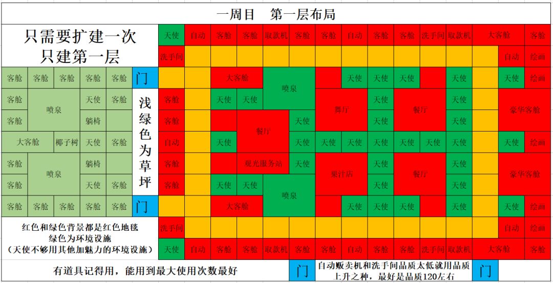 首先呢,通关前只建一层,道具多用用,评审团和国王想不满意都难~(评审团和国王都过了再建其他层) 一:布局图和一周目攻略(橙色:波斯地毯;绿色和红色:都是红色地毯,绿色是环境设施;浅绿色:草坪。) 游轮每个国第一次去都会给钱,所有每个国都要去一次哦~ 一周目布局: 好处:路程短,设施较少,只扩建一次,省钱。 坏处:经常出现排队,影响游客花钱和取钱速度。 八年六月所有评审团都通过。 八年八月出开罗岛。