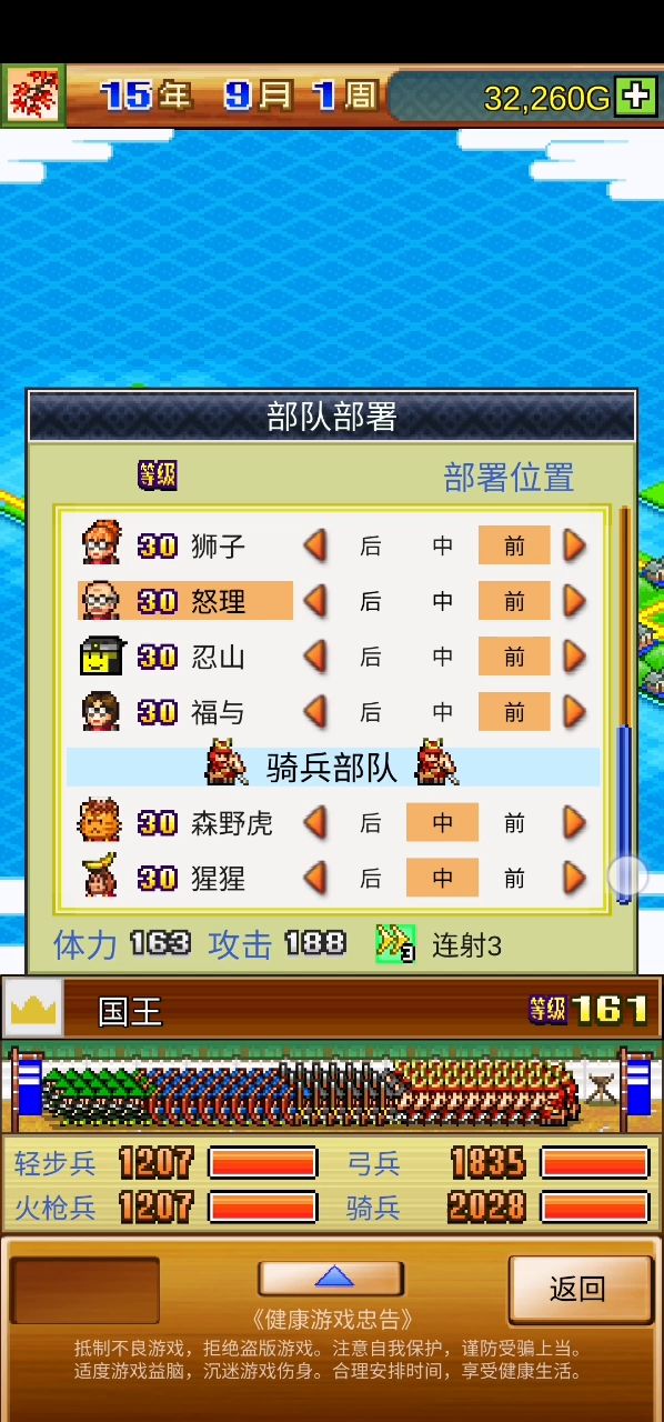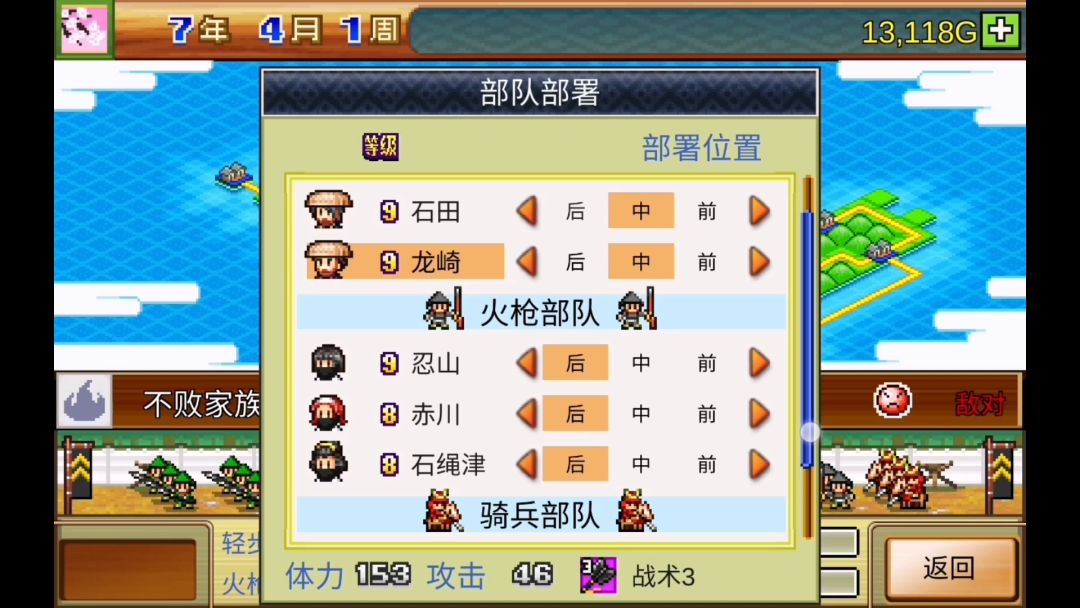 步兵332 弓兵256 火枪兵398 骑兵356 忍者平均等级7.7,最高等级12 真不败的各兵种兵力为750,看似只有750,实际上真不败军中有忍者加持和装备加持,兵力不止750,真实兵力能上千。 但是没有什么好怕的,打仗靠的是谋略,以少胜多时这款游戏的常态。 为了录这视频我也是sl了几十次,胜负的关键是前两回合自家的狗不能被射死,不然步兵没了移速加成砍不完了。这几十次里只有两次对手开局没有射狗的,结果当时没有录进去,被迫继续sl。 如果喜欢的话,欢迎点赞评论。