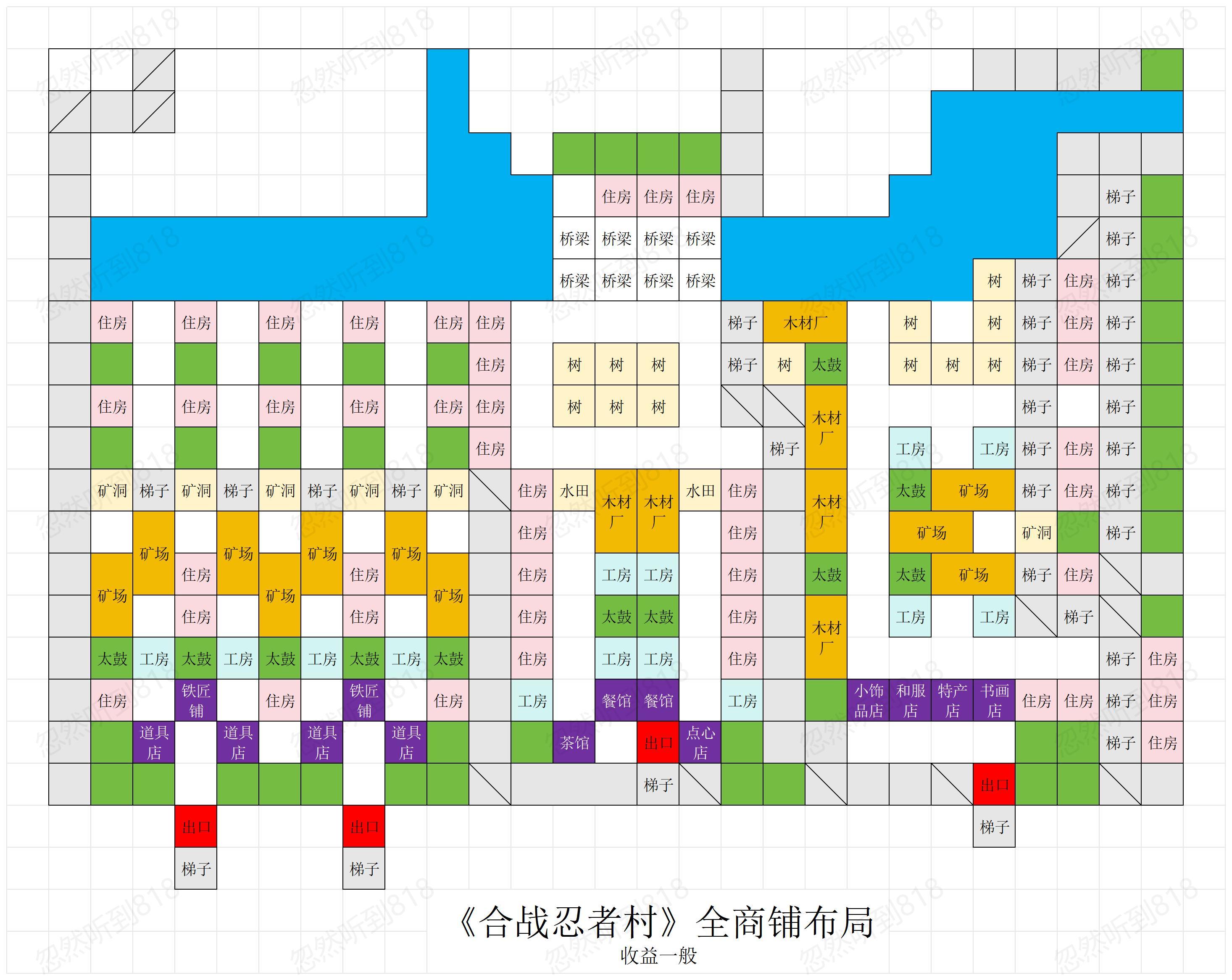 我总结了一些经验分享给各位,算是一种攻略的补充吧。分两部分来说,先说经营。忍者村只有一钟货币,就是钱,钱能转换为战斗力,钱越多战斗力越强。一个优秀的布局相比随意的布局赚的钱要多太多了。布局讲究的是效率和加成。忍者村里店铺虽多,但有用的其实只有道具店和铁匠铺,因为这二者的最强商品价格高,而且只需要矿石即可加工,加工成本低。(要注意道具店第一个商品需要木头打造,请确保道具店解锁第二个商品后再开始最