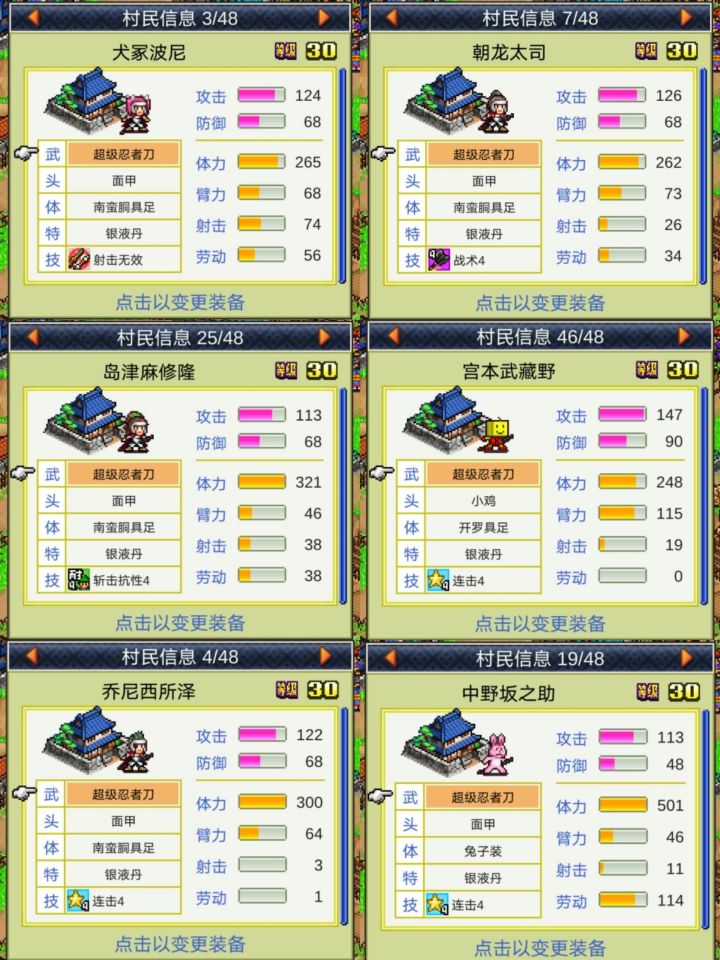 合战忍者村一直在开罗的作品中最有人气的一部之一。大概是因为本作类似于光荣的《三国志》,《信长之野望》这样的高人气战略游戏作品。合战忍者村游戏的体积虽小,但是策略性一点都不输PC端游。本篇想重点阐述一下村民的配置,因为初学者看到众多的村民会很头疼。很可能培根本用不到的人,浪费资源,请看下文。【技能】大部分村民都拥有自己的技能,其中有些人物的技能重复,随着村民级别的提高,技能也会相应提高。