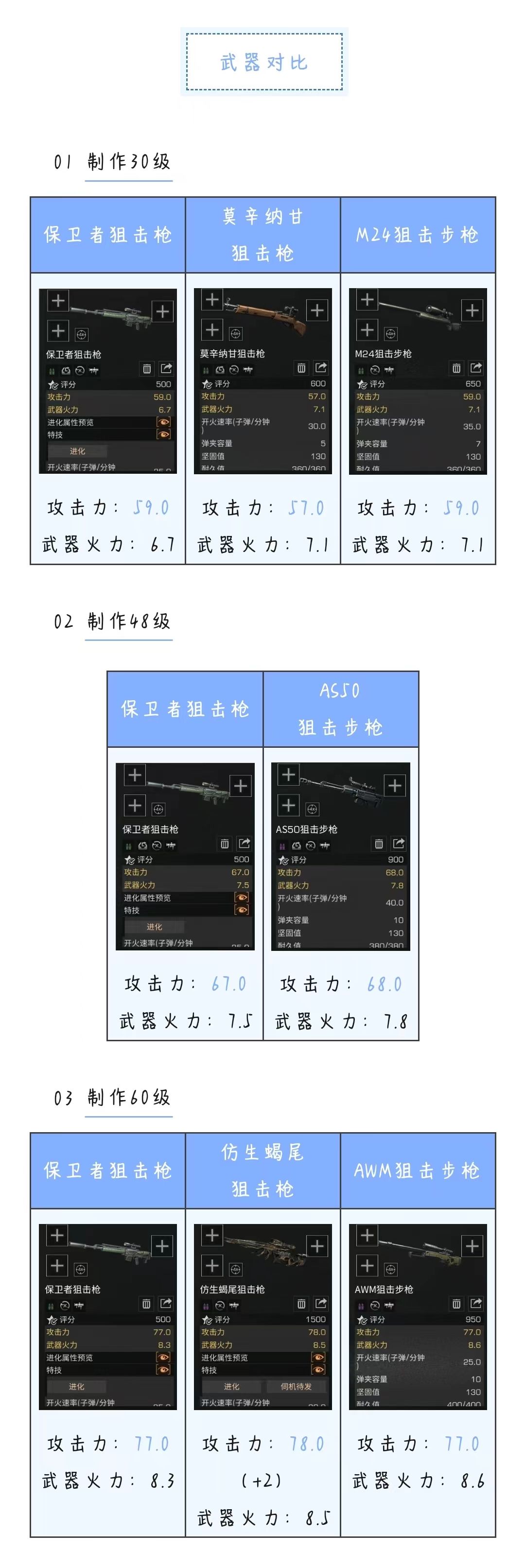 幸存者们周日好呀 玩家们心心念念的 狙击枪解析对比来啦 保卫者狙击枪vs仿生蝎尾狙击枪 vs各庄园等级狙击枪 谁才是你最爱用的狙击枪呢? 一起来看看对比解析吧! 本次将采用的武器均为普通武器 在同庄园等级、不专研、 无装备核芯的情况下进行属性对比 数据仅供参考 总结 制作60-75级 同庄园等级的情况下 仿生蝎尾狙击枪的属性 会比版本狙击枪更好 其他等级时 仿生蝎尾狙击枪的属性 要比版本狙击枪略逊