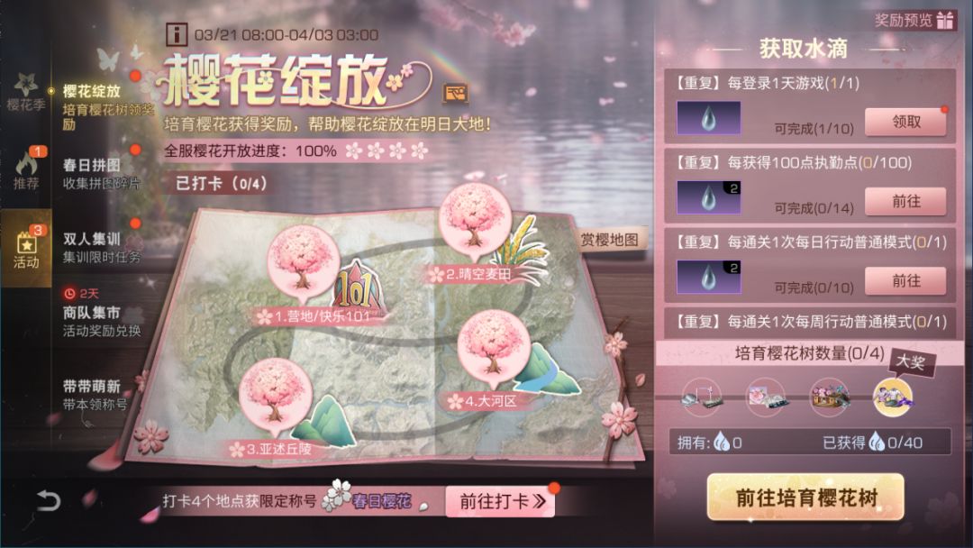 幸存者们好呀 春天,是樱花绽放的季节 如梦如幻的粉色花海 荡漾在明日世界的各个角落 快收下这份樱花打卡攻略! 一起感受春天的美好吧~ 樱花绽放 想踏上这片粉色的海洋 想在樱花林中漫步 想抬头一看便是满园春色 让明日世界盛开美丽的樱花吧! 明明如是说 打卡地点 明日世界里共有四个地点 绽放了美丽的樱花 快跟着明明一起看看都在哪里吧~ 营地/快乐101 来到快乐101老家门口 明明一眼就看到了一
