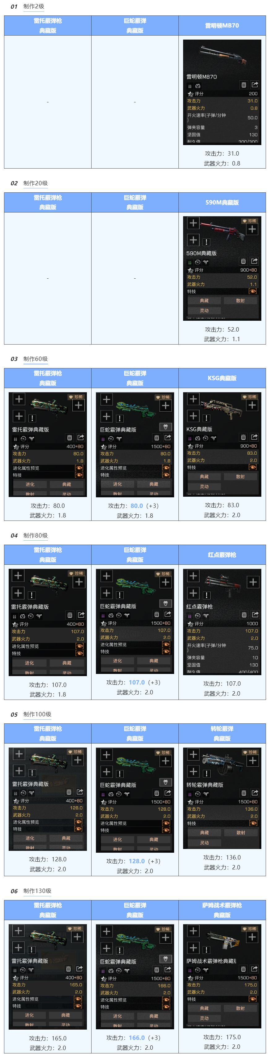 幸存者们大家好呀 新一期武器解析对比来啦 雷托霰弹枪vs仿生巨蛇霰弹枪 vs各庄园等级霰弹枪 谁才是你最爱用的霰弹枪呢? 一起来看看对比解析吧! 注意提醒 本次将采用的武器均为典藏版 本次在同庄园等级、不专研、 无装备核心的情况下进行属性对比 数据仅供参考 武器对比 仿生巨蛇霰弹枪 拥有狩猎模式 开启后可 增加基础攻击力(+3) 所以在开启狩猎模式后 仿生巨蛇霰弹枪攻击力 均会高于雷托霰弹枪 在制