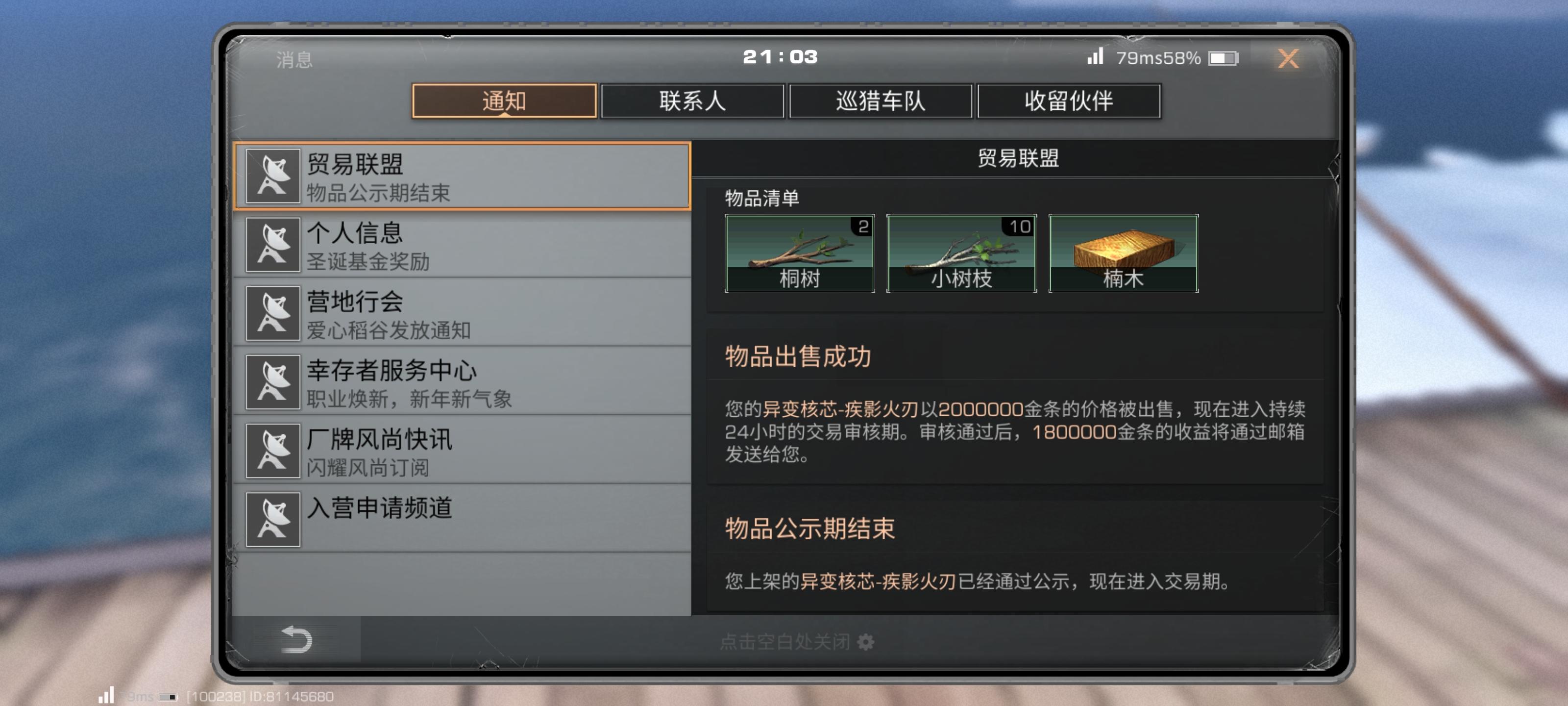 他卖出去了!它卖出去了!它卖出去了!!!!!!啊啊啊啊啊啊啊啊这是老子玩了那么久的明日第一次卖出那么多金条啊,哈哈哈哈哈哈哈哈哈哈哈哈哈(上次挂了十天没卖出去,这次真的卖出去了,真的,太好了哭哭哭哭哭)