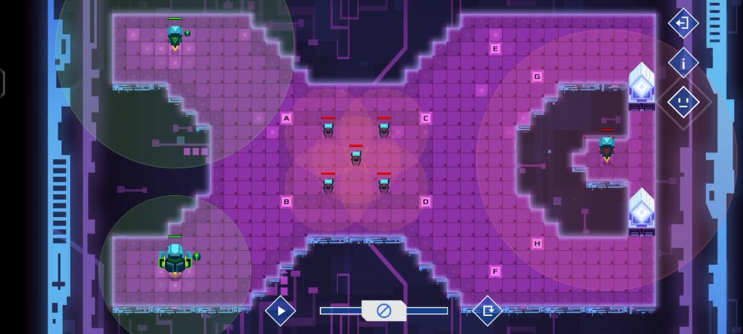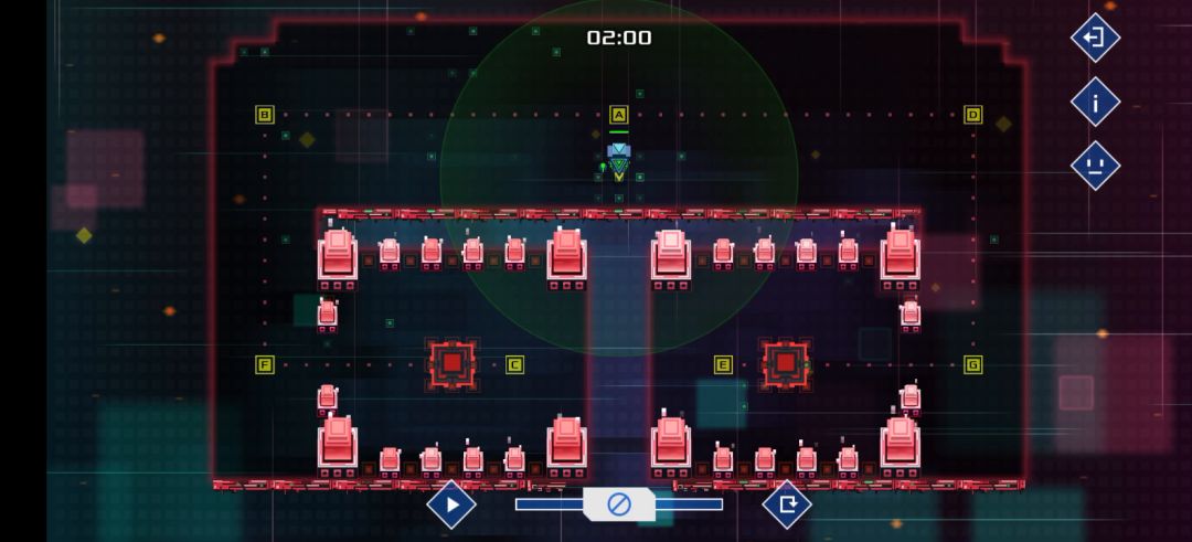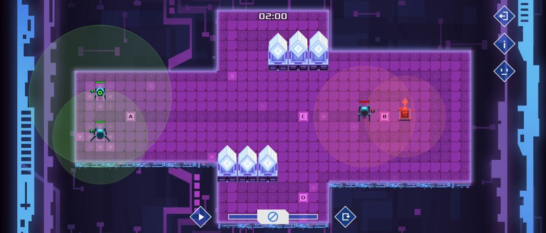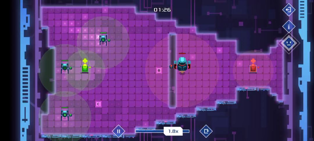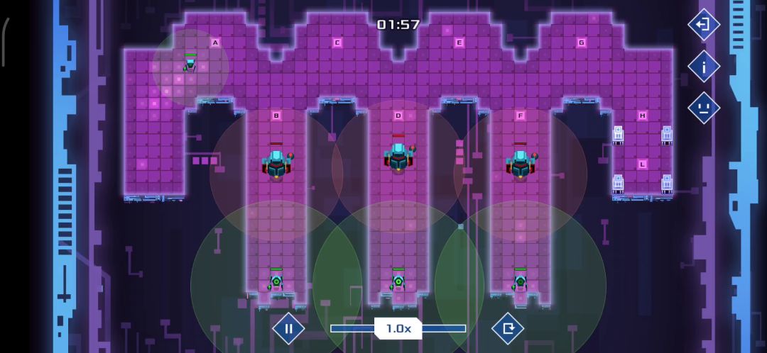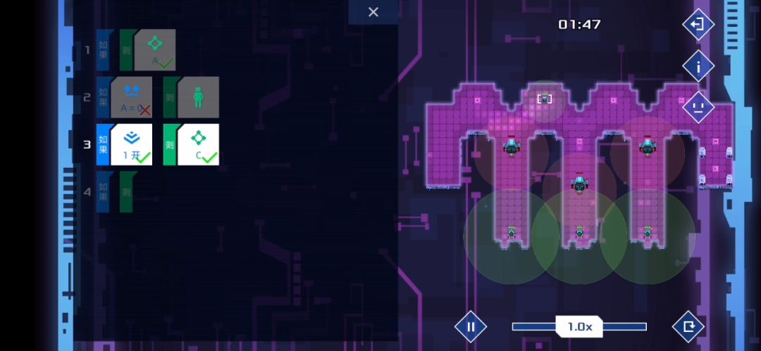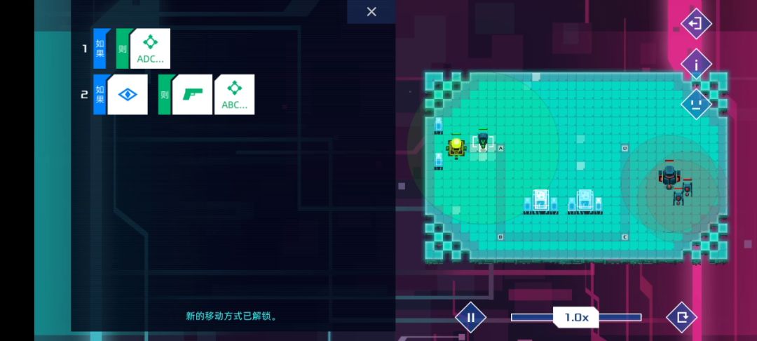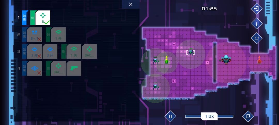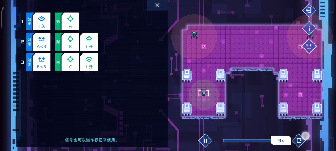 你知道需要循环轮流与敌方交战了,那么三个机器人的第一行分别前往abc三个点等待,然后b点机器人第二行:发现敌人则1开,三个机器人最后一行分别是:如果1开则开火并从自己位置开始顺时针或者逆时针循环移动,根据指令冲突时下排优先,当1开后三个机器人则会一直循环下去😇