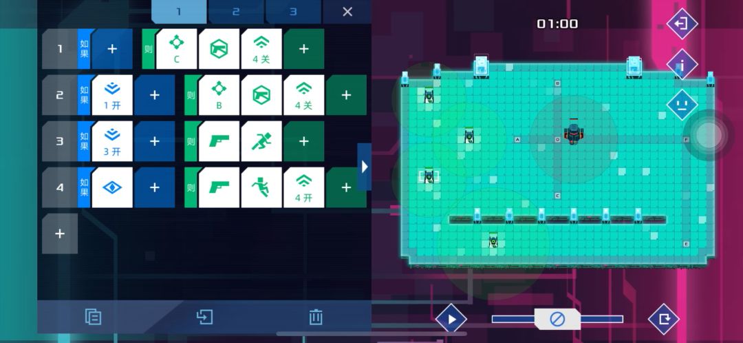 第十四关中间这个友军因为敌人的运动有规律所以可以不设计程序,有意思