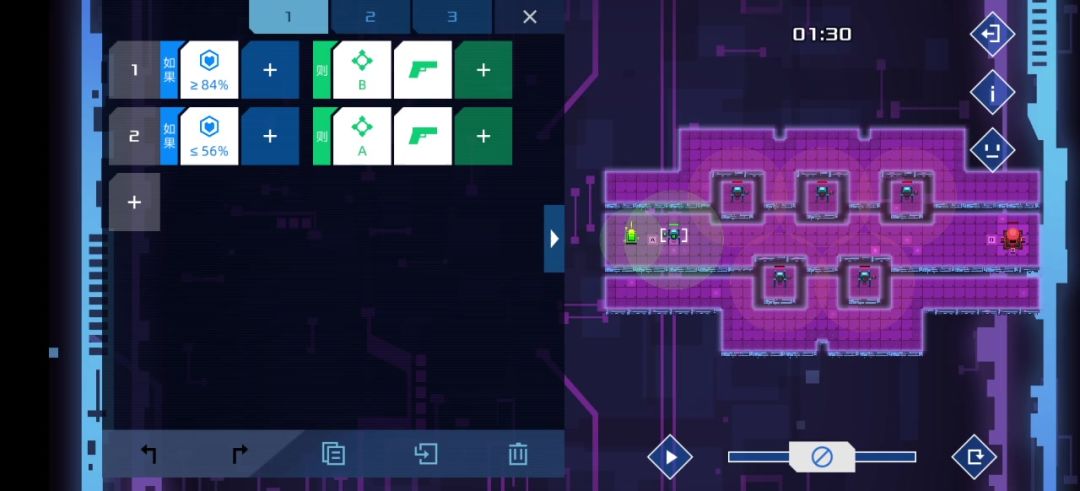 第十四关中间这个友军因为敌人的运动有规律所以可以不设计程序,有意思
