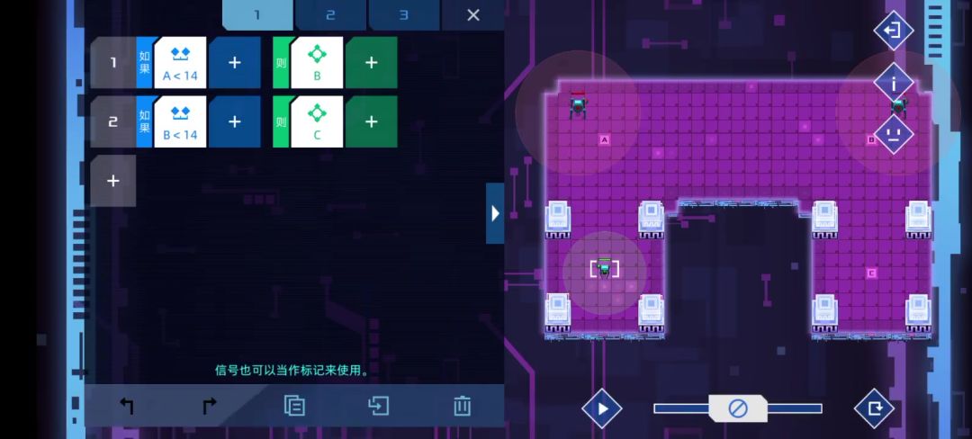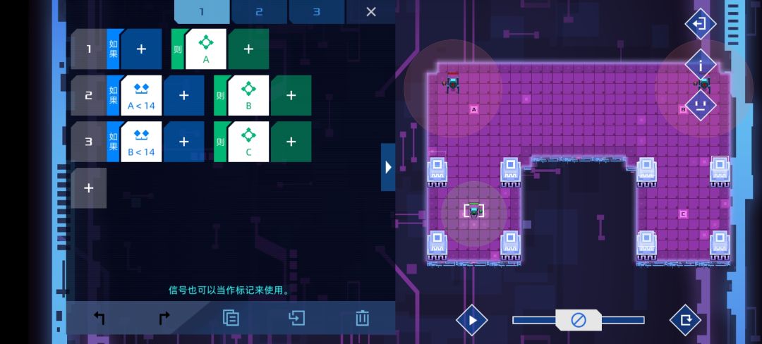 大佬们,按这个游戏的执行来说不应该再两条代码同时成立时,优先执行下面那个代码吗,而且旁边的侦查机代码好像就是符合下面代码优先的吧,一般情况下关闭信号,遇到敌人再开 可为什么我一开始的那个机器人的代码会进入死循环,虽然我这个代码确实无法通关,但是不理解这一步执行为何会这样。求助求助#异常