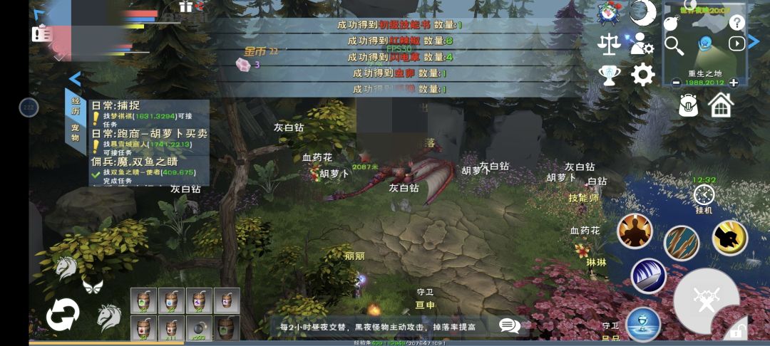 金币,,,可以抓捕宠物出售,菜地种植琥珀之红出售以及挂机低级野王获得在暴雪成外还可以挂机鹿获得。 云辰石,星辰石,月辰石,可以采集获得,在地图上有刷新点,在采集前设置里有挂机刷新资源调到最低。采集一圈后挂机几秒等资源刷新再来一圈。 传送石可以在世界boss获得。注意节省,后面使用的比较多,有能力着可以整个无线传送石。 宠物生魔书,可以挂机无限洞穴获得和boss获得,关键还是无限洞穴,只需要调到挂机
