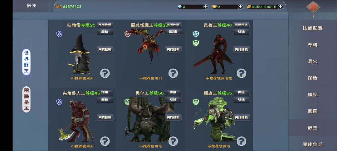 #游戏攻略 新世界打圣王或野王,武器用对了事半功倍,下面是本人亲测效率组合。 打圣王时,别忘记给BOSS破盾,破盾后输出更快。 新世界圣王武器组合: 莽刀+腐弓 红色破物 地龙圣王 物刃+腐弓 红色破物 旋转圣王 暴龙圣王 魔刃+腐弓 蓝色破魔 冰雹圣王 魔刃+星辰杖 蓝色破魔 萨满圣王 树魔圣王 新世界野王武器组合: 魔刃+星辰杖 蓝色破魔 烈焰猿魔 蝴蝶精灵王 腐蚀魔 莽刀+腐弓