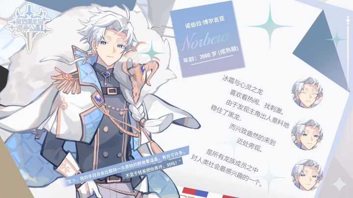 诺伯拉·博尔吉亚cv:yoru(日配)冰霜与心灵之龙2000岁,成熟期。喜欢看热闹、找刺激。是所有龙族成员之中对人类社会最感兴趣的一个。行事风格随心所欲,游走如风,总是挂着漫不经心的笑容。时常化作人形进入人类社会,以观察人性变换为乐。人群宛若一座剧院,他是隔岸观火的观众,期待并欣赏好戏的开幕。——“呀吼。你好呀!小妹妹~你就是尼格霍德抓来的那名人类公主?”——“…真是不得了。你