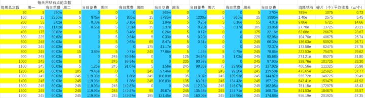 具体操作如图,每天免费都要点,图中给出的是你每天需要用钻石额外点的次数。这个表是由程序暴力枚举得出的,平均每次锻造按10碎片计算收益。我先给出一部分,等有人一周能拿出200e钻整神器我再更新。然后我在枚举的时候是按照每天是整十次枚举的,所以在每周400次和500次的时候实际上是405次和505次,实际用的时候稍微调整就好。再稍微解释一下这个表,其实本质上应该分两天点,但在总次数比较低的时候,