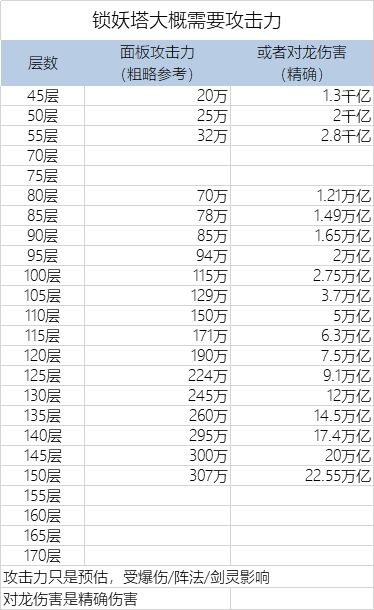经过群里无数大佬提供数据,汇总了这份锁妖塔过关图.锁妖塔每5层为一个坎,因为该层是单个怪物,群攻技能打不出伤害。具体每个坎需要攻击力如下图:第一列面板攻击力,是指人物面板上的攻击力,攻击力属于快速参考,每个人的暴击率,暴击伤害,神器加成,技能点法不同,最终的伤害也不同.第二列是对龙的伤害,正好龙是单只的怪物,也正好是60秒,所以拿来对比锁妖塔完美。对龙伤害,是比较精准的伤害,当你龙能打