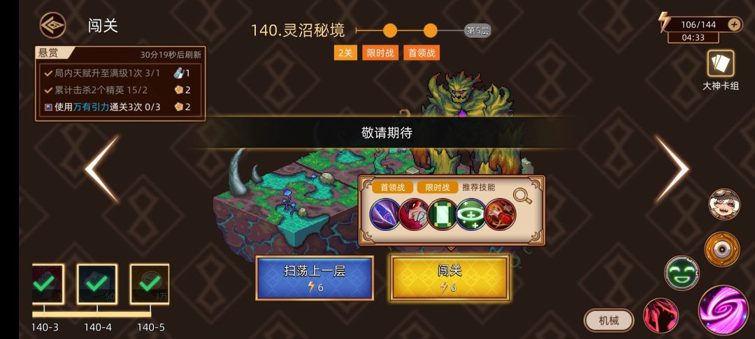 技能:汲取,黑洞,机械联盟,无人机 碰到守卫战联盟换成机械屏障 神装:左边冷却套,右边机械套 因为后期怪伤害很高,为了容错,要带段位保护这个词条 宠物:君子剑,暴脾气,狮灯 如果装备词条没有搞好,可以带僵尸或者胖虎,壶来增加容错,但是还是建议打的很吃力的时候先玩玩别的,不要硬刚闯关