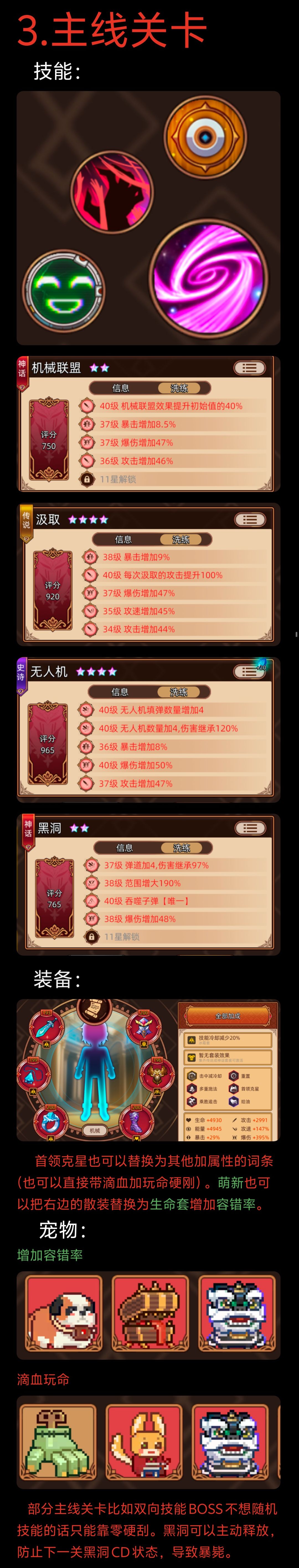 萌新培养优先推荐零>船长>铃铛 零现在打桩打矿都不错,船长主要闯关好用。铃铛是零打矿进阶版,不过打桩不行。 以下技能需要高星通关100-5很轻松 被卡关建议这套 守护己方吉祥物用这套 如遇到双向技能BOSS:可以给敌方一些防护类技能,自己带一些攻击类的技能。注意千万不要给BOSS召唤类技能。也可以不给技能,直接硬刮。角色哪个星高用哪个#游戏攻略