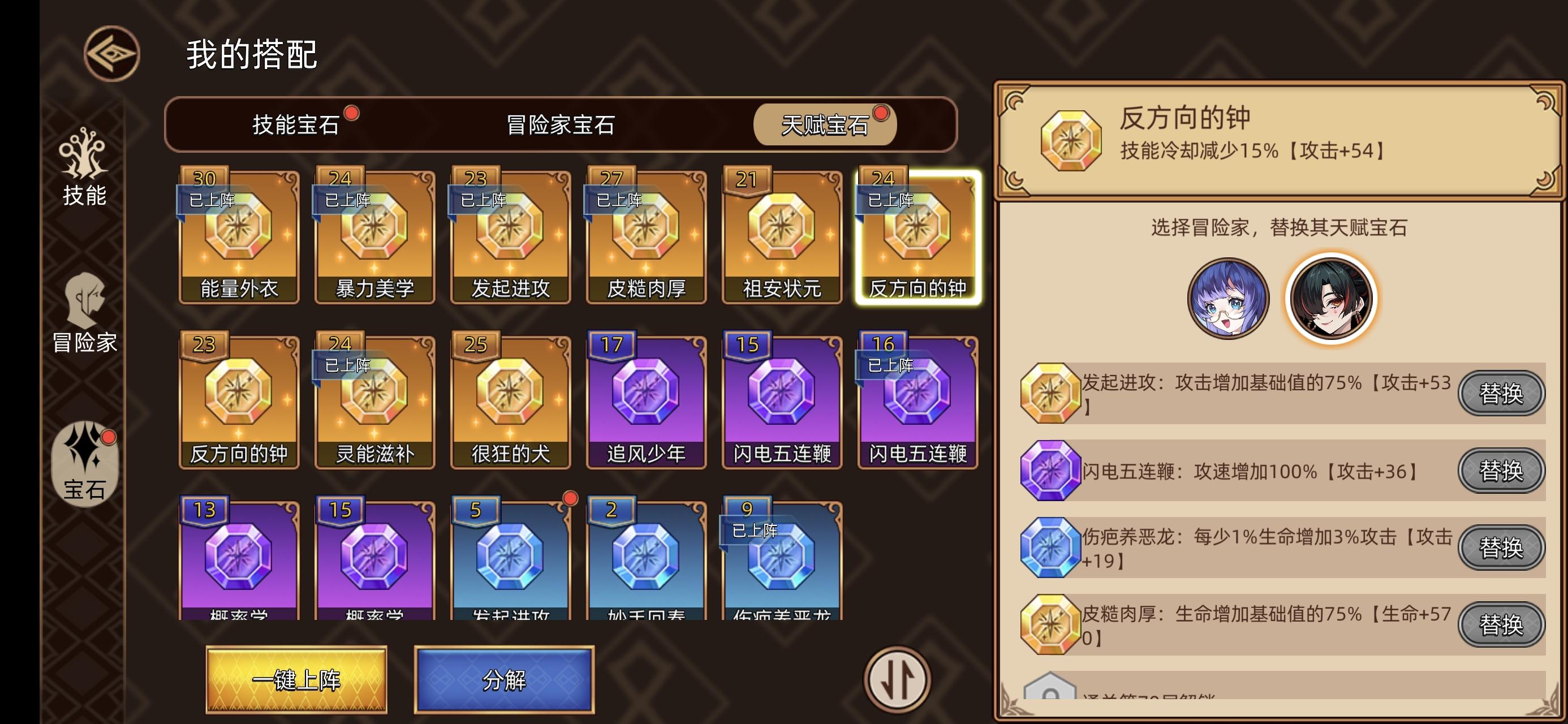 继上文奇遇:打副本中途可以碰到的属性商人,推荐购买,低廉价格即可获得属性。 宠物:神话宠物推荐携带暴脾气,君子剑(优先级最高且只要一只即可) ,狮灯。其他好用的宠物有胖虎(加生命且可以持续回血),僵小跳(额外复活一次),回甘壶(每层可获得一层圣盾), 神装:就是装备,点开有分装备和秘术两种,装备穿戴主要通用模板为左边固定冷却套,右边即为爆伤散件,左边羁绊>词条>等级,右边词条>等级,这时候就